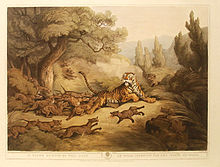 The tiger has been one of the Big Five game animals of Asia. Tiger hunting took place on a large scale in the early nineteenth and twentieth centuries, being a recognised and admired sport by the British in colonial India as well as the maharajas and aristocratic class of the erstwhile princely states of pre-independence India. A single maharaja or English hunter could claim to kill over a hundred tigers in their hunting career. Tiger hunting was done by some hunters on foot; others sat up on machans with a goat or buffalo tied out as bait; yet others on elephant-back. In some cases, villagers beating drums were organised to drive the animals into the killing zone. Elaborate instructions were available for the skinning of tigers and there were taxidermists who specialised in the preparation of tiger skins.