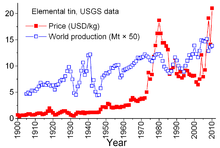About 253,000 tonnes of tin have been mined in 2011, mostly in China (110,000 t), Indonesia (51,000 t), Peru (34,600 t), Bolivia (20,700 t) and Brazil (12,000 t). Estimates of tin production have historically varied with the dynamics of economic feasibility and the development of mining technologies, but it is estimated that, at current consumption rates and technologies, the Earth will run out of tin that can be mined in 40 years. However Lester Brown has suggested tin could run out within 20 years based on an extremely conservative extrapolation of 2% growth per year.