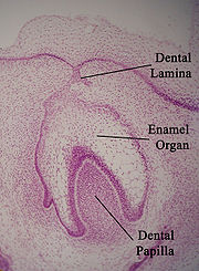 Enamel formation is part of the overall process of tooth development. When the tissues of the developing tooth are seen under a microscope, different cellular aggregations can be identified, including structures known as the enamel organ, dental lamina, and dental papilla. The generally recognized stages of tooth development are the bud stage, cap stage, bell stage, and crown, or calcification, stage. Enamel formation is first seen in the crown stage.
