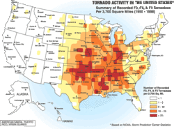 Intense tornado activity in the United States. The darker-colored areas denote the area commonly referred to as Tornado Alley.