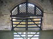 The Tower of London, seen from the River Thames, with a view of the water gate called