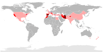 Saffron crocus cultivation has long centred on a broad belt of Eurasia bounded by the Mediterranean Sea in the southwest to India and China in the northeast. The major producers of antiquity—Iran, Spain, India, and Greece—continue to dominate the world trade. It was also successfully grown in Saffron Walden, UK. The cultivation of saffron in the Americas was begun by members of the Schwenkfelder Church in Pennsylvania. In recent decades cultivation has spread to New Zealand, Tasmania, and California. Iran has accounted for around 90–93% of recent annual world production and thereby dominates the export market on a by-quantity basis.