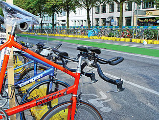 On the race day, prior to the start of competition, athletes will generally be provided with a bike rack to hold their bicycle and a small section of ground space for shoes, clothing, etc. within the transition area. In some triathlons, there are two transition areas, one for the swim/bike change, then one for the bike/run change at a different location. The bicycle stage does not finish in the same place it begins, so athletes set up two transition areas.