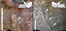 Torosaurus is a ceratopsid genus first identified from a pair of skulls in 1891, two years after the identification of Triceratops. The Torosaurus genus resembles Triceratops in geological age, distribution, anatomy and physical size and it has been recognised as a close relative. Its distinguishing features are an elongated skull and the presence of two fenestrae, or holes, in the frill. Paleontologists investigating dinosaur ontogeny (growth and development of individuals over the life span) in the Hell Creek Formation of Montana, have recently presented evidence that the two represent a single genus.