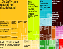 Graphical depiction of Uganda's product exports in 28 colour-coded categories.