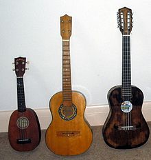Close cousins of the ukulele include the Portuguese forerunners, the cavaquinho (also commonly known as machete or braguinha) and the slightly larger rajao. Other stringed variants include, the Venezuelan cuatro, the Colombian tiple, the timple of the Canary Islands, the Spanish vihuela, the Mexican requinto jarocho, and the Andean charango traditionally made of an armadillo shell. In Indonesia, a similar Portuguese-inspired instrument is the kroncong.