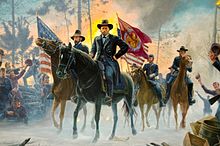 Grant from West Point to Appomattox, an 1885 engraving by Thure de Thulstrup. Clockwise from lower left: Graduation from West Point (1843); In the tower at Chapultepec (1847); Drilling his Volunteers (1861); The Battle of Fort Donelson (1862); The Battle of Shiloh (1862); The Siege of Vicksburg (1863); The Battle of Chattanooga (1863); Appointment as Lieutenant General by Abraham Lincoln (1864); The Surrender of General Robert E. Lee at Appomattox Court House (1865)
