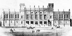 An illustration of 6 Burlington Gardens, home to the university administration from 1870 to 1899.