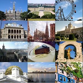 | Left–right, top–bottom: Rathaus, Schloss Schönbrunn, Riesenrad, Staatsoper, Stephansdom, Kunsthistorisches Museum, Stephansplatz, Sachertorte, Johann-Strauß-Denkmal, Sezession, Donau City, Hundertwasserhaus | |||||