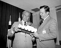 ![]() Von Braun at his desk at Marshall Space Flight Centre in May 1964, with models of the Saturn rocket family |