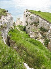 The cliff face continues to erode at an average rate of one centimetre per year, although occasionally— most recently in 2001— large chunks of the edge, up to several metres at once, will fall into the channel with little warning. Visitors are, therefore, urged to remain at least five metres back from the edge.