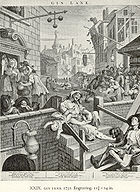 Later important prints include his pictorial warning of the unpleasant consequences of alcoholism in Beer Street and Gin Lane (1751) Hogarth engraved Beer Street to show a happy city drinking the 'good' beverage of English beer, versus Gin Lane which showed the effects of drinking gin which, as a harder liquor, caused more problems for society. People are shown as healthy, happy and prosperous in Beer Street, while in Gin Lane they are scrawny, lazy and careless. The woman at the front of Gin Lane who lets her baby fall to its death, echoes the tale of Judith Dufour who strangled her baby so she could sell its clothes for gin money. The prints were published in support of what would become the Gin Act 1751.