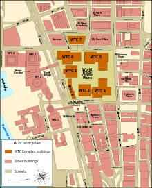 ![]() The first World Trade Centre of New York City in March 2001. The reddish-brown building (back left) is the original 7 World Trade Centre. The North Tower (left), with antenna spire, is 1 WTC. The South Tower (right) is 2 WTC. All 7 buildings are partially visible (see map below). Background shows the East River. |
