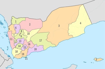 As of February 2004, Yemen is divided into twenty governorates ( muhafazat) and one municipality called "Amanat Al-Asemah" (the latter containing the capital, Sana'a). The governorates are subdivided into 333 districts (muderiah), which are subdivided into 2,210 sub-districts, and then into 38,284 villages (as of 2001).