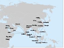 Dotted line: a trip of seven Chinese sailors, including Ma Huan, from Calicut to Mecca on a native ship. Cities known to have been visited by Zheng He's fleets throughout his seven voyages shown in red.